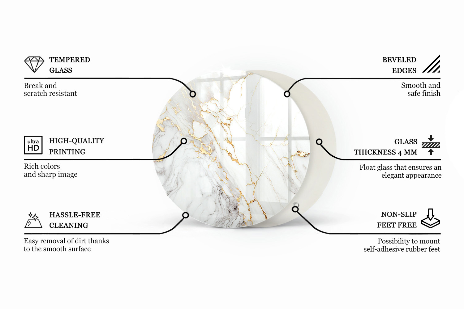 The polished edges feel comfortable to the touch and add a neat finish to any room, while the weather resistance means you can also use this glass for table top round designs on covered terraces or loggias. The clear, high‑transmission surface keeps the original look of your table visible, with the printed Stylish marble pattern motif adding just the right amount of character. Fast order processing and a solid manufacturer’s warranty complete a practical upgrade that’s simple to install and even simpler to live with.
